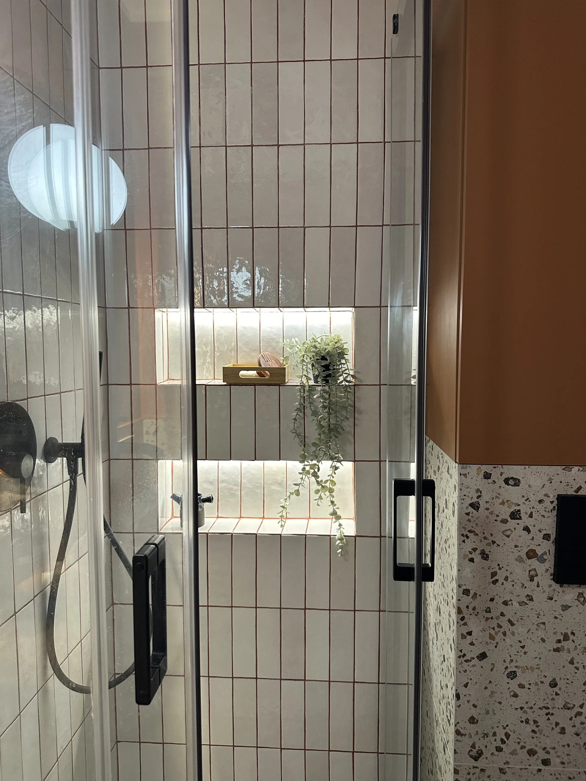 Strefa prysznica została wyposażona w dwie podświetlane nisze, a całość dopełniają baterie podtynkowe oraz owalna umywalka nablatowa. Oświetlenie pełni tu nie tylko funkcję użytkową, ale także dekoracyjną.
