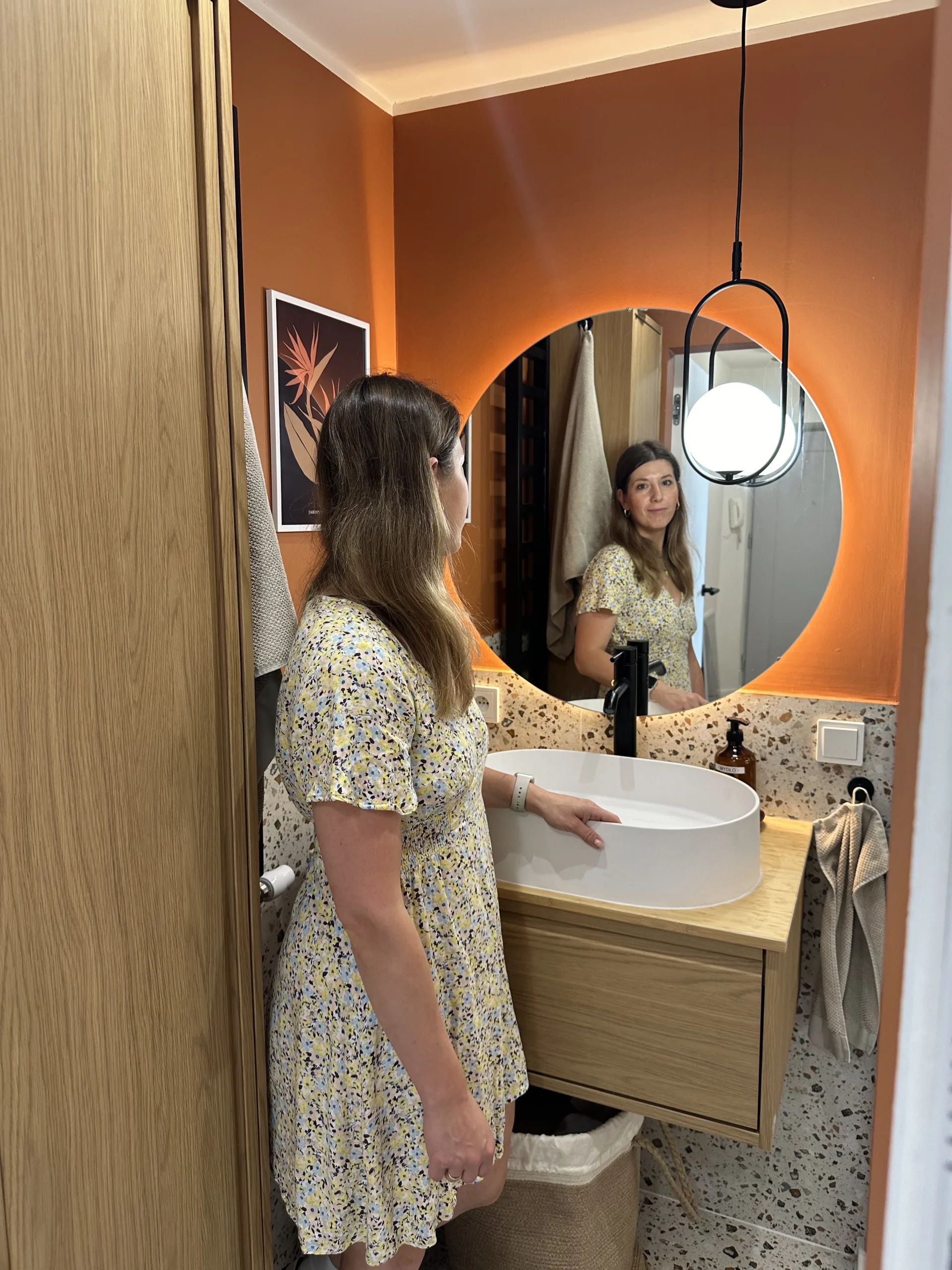 W łazience zastosowano płytki lastryko na podłodze i ścianach oraz białe, podłużne płytki typu cegiełka, zaakcentowane fugą w kolorze cegły i terakoty. Zaprojektowano fornirowane, dębowe meble łazienkowe, w których ukryto piec gazowy.