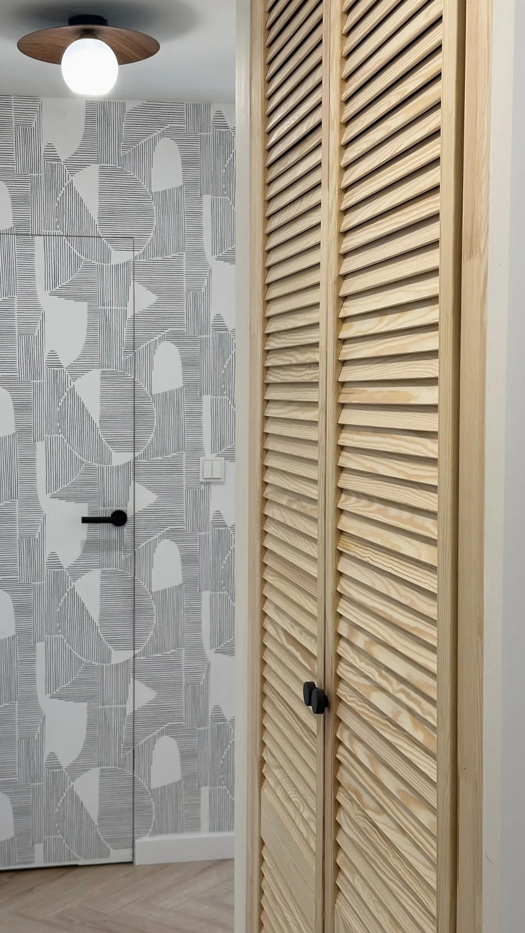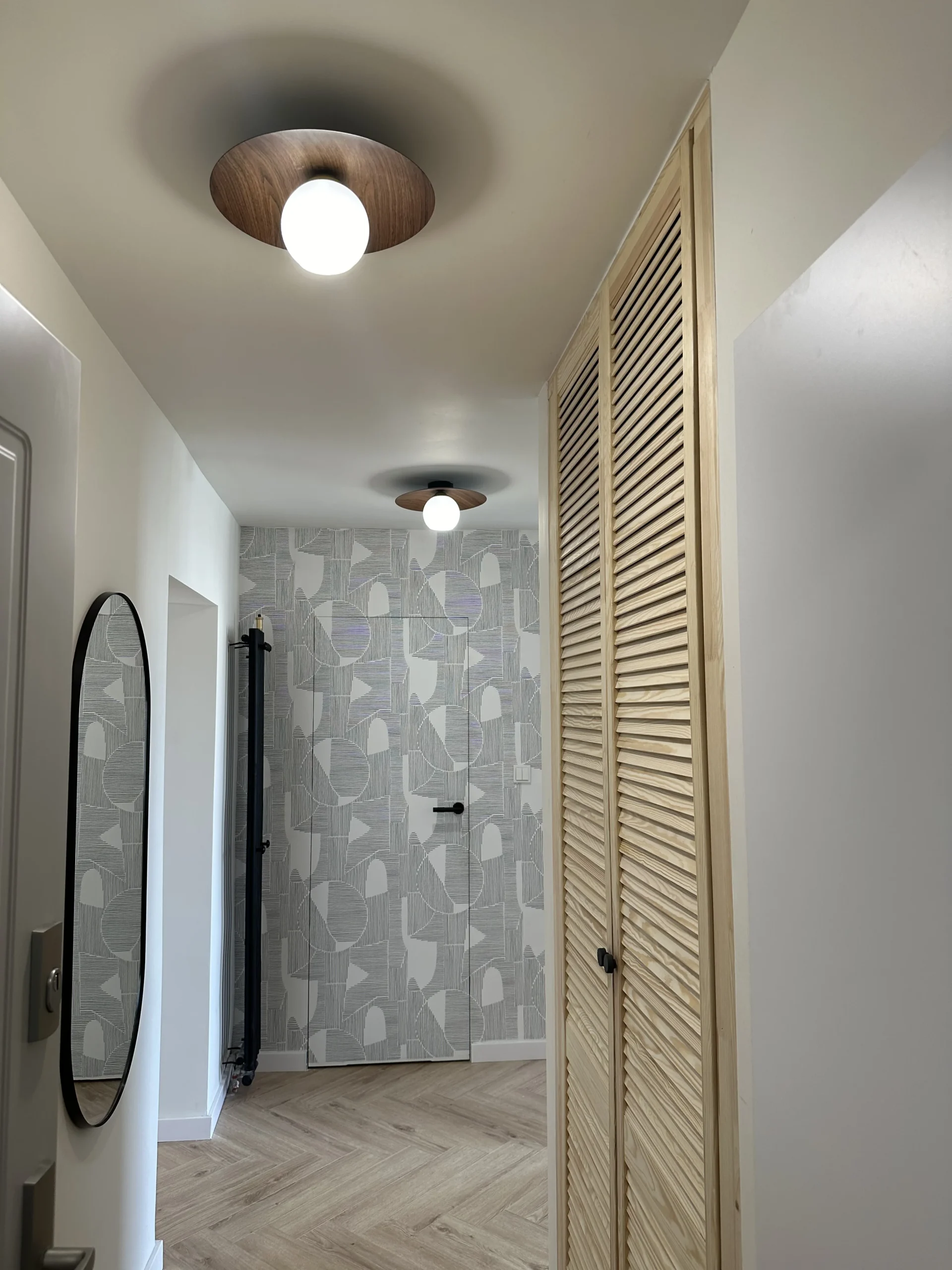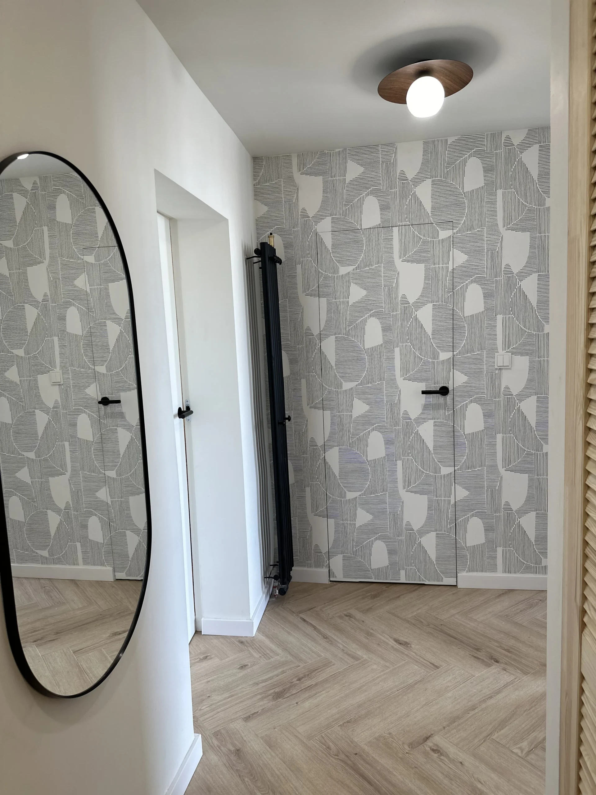 W korytarzu zastosowano czarny grzejnik retro, a wszystkie drzwi wykonano z ukrytą ościeżnicą, co podkreśla spójność i nowoczesny charakter projektu. Całość uzupełniają starannie dobrane detale oraz oświetlenie inspirowane stylistyką retro.